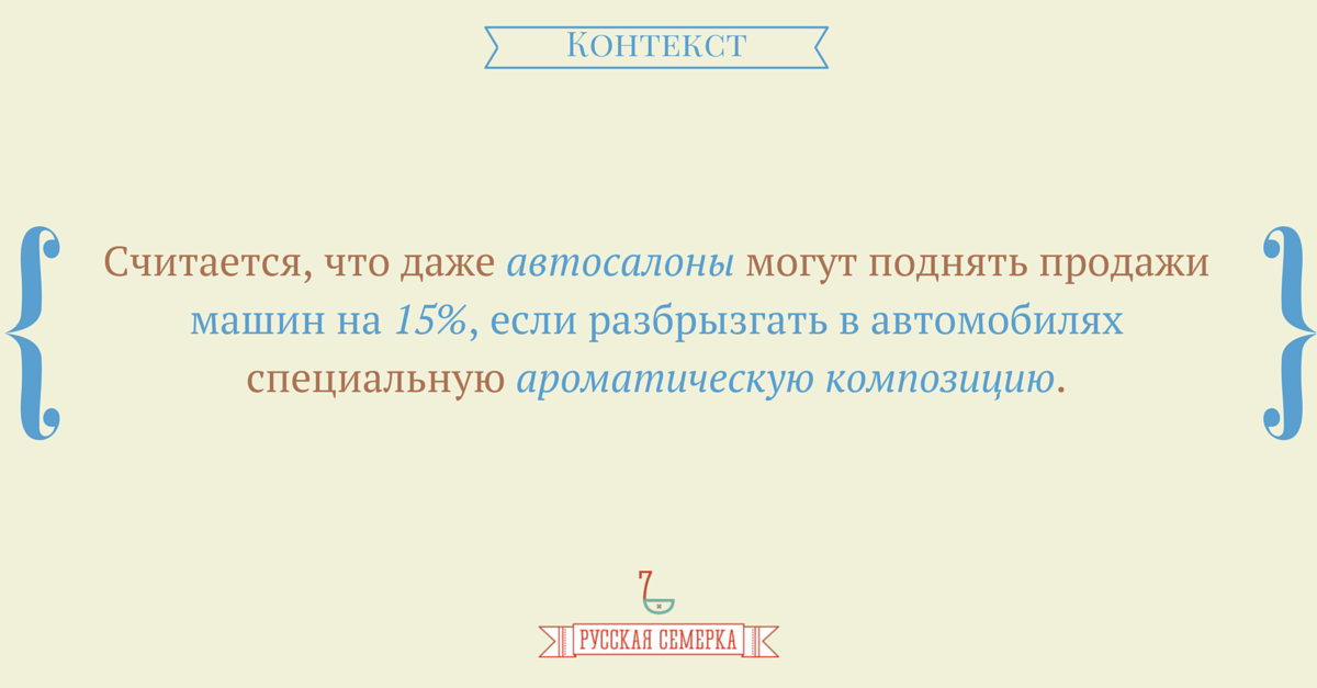 Кроме того, что запахи запускают определенные химические реакции в мозге, ароматы имеют и другое действие — ощущая их, мы попадаем под власть ассоциаций. Все зависит от того, каким событиям, картинам, чувствам и эмоциям сопутствовал этот запах. Ассоциации могут быть как общенациональными, так и индивидуальными.