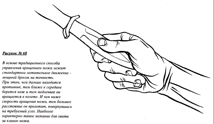При этом, чем дальше находится противник, тем ближе к середине берется нож и тем медленнее он вращается в полете. А чем ниже скорость вращения ножа, тем большее расстояние он пролетит, совершив один оборот (рис. 68, 69).