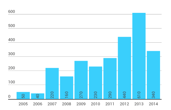Общее число инсталлированных к 2015 г. промышленных роботов в Российской Федерации – около 2 740 шт. (рис. 4). С 2010 по 2013 год наблюдался стабильный рост продаж промышленных роботов – в среднем около 20% в год. В 2013 г. продажи достигли своего максимума – 615 роботов (увеличение на 34% по сравнению с 2012 г.), но в 2014 г. произошло резкое падение продаж на 56% – до приблизительно 340 роботов. Причиной этому является сильное изменение валютного курса.
