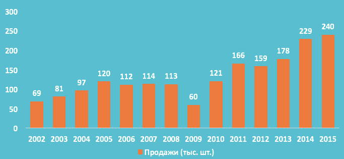 Европа – второй по размеру рынок, где продажи в 2014 г. увеличились на 5%, т.е. до 45 000 шт. В 2015 г. продажи в Европе выросли на 9% и достигли 50 000 единиц. Самый бурный рост в 2015 г. продемонстрировал рынок Восточной Европы – в 29%.