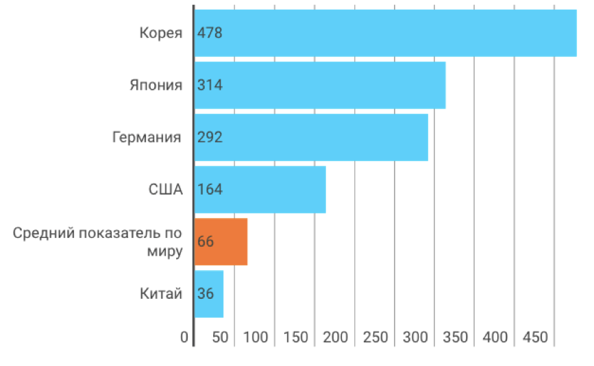Приблизительная мировая плотность роботов равняется 66 установленным промышленным роботам на 10 000 работников сферы обрабатывающей промышленности (рис. 2). Производства с самым высоким уровнем роботизации – это производства в Республике Корея, Японии и Германии. За счет продолжения расширенной установки роботов на протяжении последних нескольких лет в 2014 г. Республика Корея была первой по уровню плотности роботов (478 промышленных роботов на 10 000 работников). Продолжает снижаться плотность роботов в Японии: в 2014 г. она достигла отметки в 314 единиц. В Германии наблюдается обратная динамика: плотность роботов выросла до 292 единиц. Соединенные Штаты Америки входят в пятерку крупнейших мировых рынков роботизированного производства: плотность в США в 2014 г. составила 164 единицы техники на 10 000 рабочих. Китай – самый большой рынок робототехники в мире с 2013 г. – достиг отметки в 36 единиц техники на 10 000 рабочих, что демонстрирует высокий потенциал для дальнейшей установки роботов в этой стране.