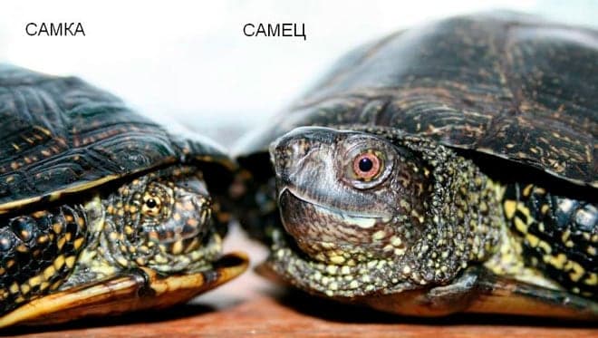Половая зрелость приходит в возрасте 6–8 лет, когда панцирь вырастает до 10 см. Определите пол болотной рептилии по признакам: