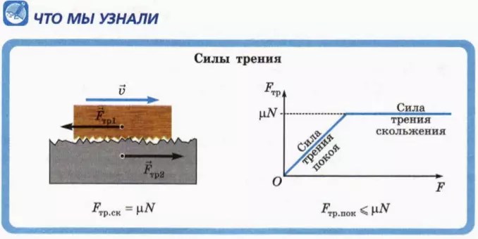 Если тело движется, то сила трения, действующая на него со стороны поверхности, не исчезает, такой вид трения называется трение скольжения . Измерения показывают, что сила трения скольжения по величине практически равна максимальной силе трения покоя (рис. 9).