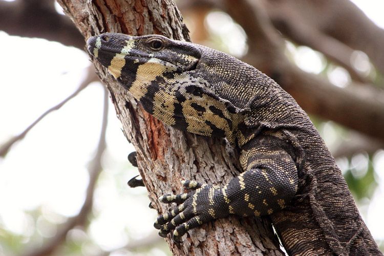 Пестрый варан (Varanus varius) достигает в длину 2 м и славится своей способностью карабкаться по деревьям.