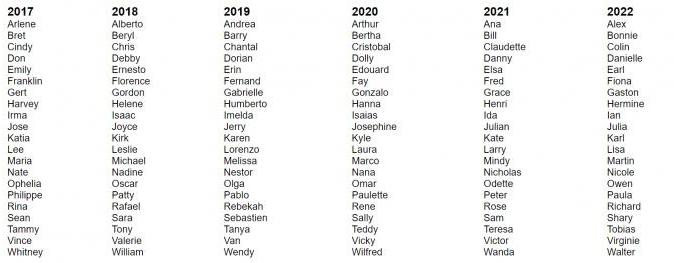 Для ураганов Атлантического бассейна есть 6 алфавитных перечней, каждый из 21 имени. Они используются шесть лет подряд, а потом повторяются.