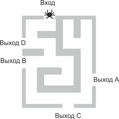 На рисунке изображён лабиринт. Паук заползает в лабиринт в точке «Вход». Развернуться и ползти назад паук не может. На каждом разветвлении паук выбирает путь, по которому ещё не полз. Считая выбор дальнейшего пути случайным, определите, с какой вероятностью паук выйдет через выход А.