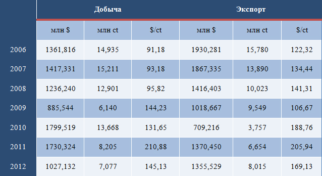 Хромиты добываются в количестве 67 % от общего количества, а доля добычи руд марганца - 57 % от всего объема.