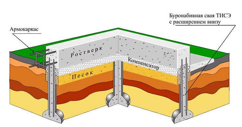 Этот вариант сочетает достоинства свайного и ленточного типа фундаментов, при том, что объединение значительно компенсирует недостатки, проявляющиеся по отдельности: